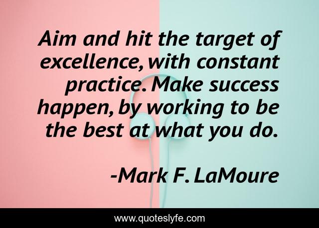 This page presents the quote "Aim and hit the target of excellence, with constant practice. Make success happen, by working to be the best at what you do.". Author of this quote is Mark F. LaMoure. This quote is about motivation, success, excellent-people, excellence, self-improvement, inspirational, excellent, enthusiasm,.