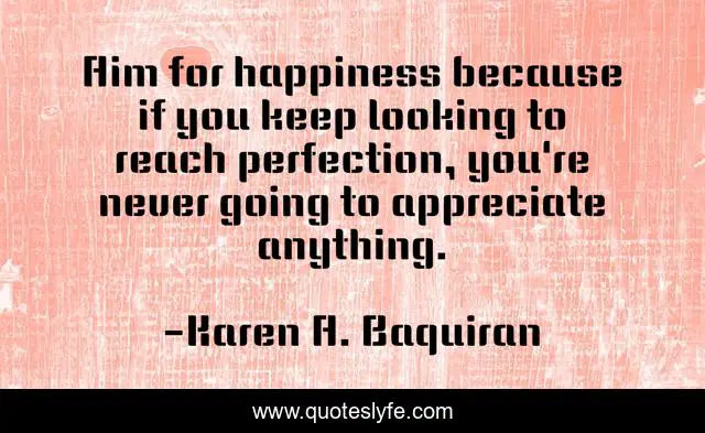 This page presents the quote "Aim for happiness because if you keep looking to reach perfection, you're never going to appreciate anything.". Author of this quote is Karen A. Baquiran. This quote is about gratitude, appreciation, loveyourself, loveyourselfmovement, happiness,.