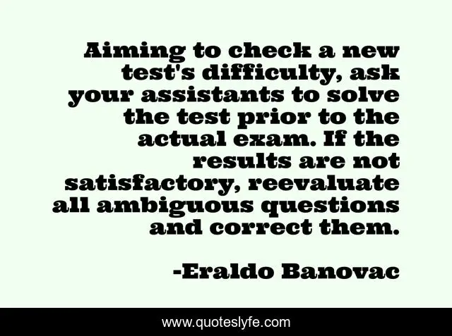 This page presents the quote "Aiming to check a new test's difficulty, ask your assistants to solve the test prior to the actual exam. If the results are not satisfactory, reevaluate all ambiguous questions and correct them.". Author of this quote is Eraldo Banovac. This quote is about learning, exam, studying, questioning, examination, questions, test, education,.