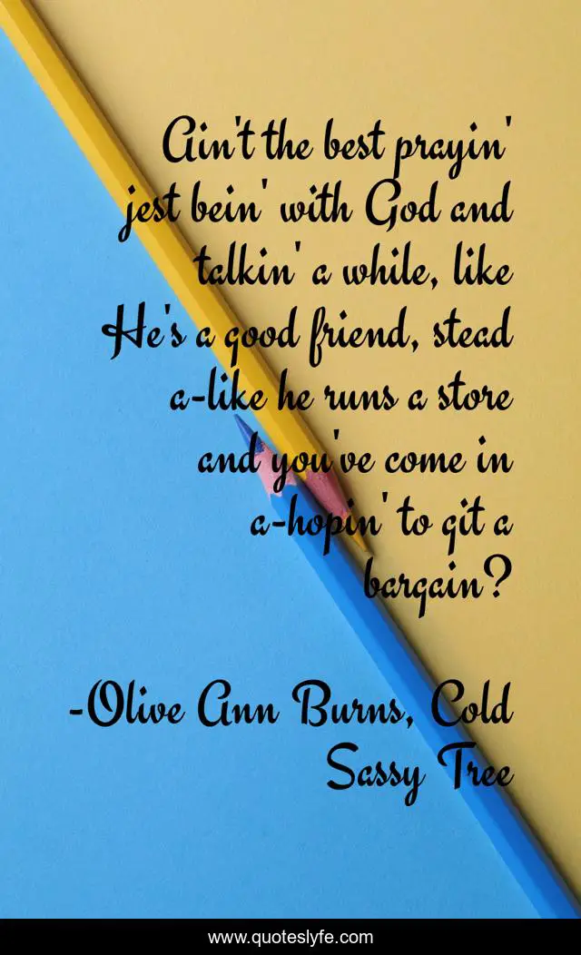 This page presents the quote "Ain't the best prayin' jest bein' with God and talkin' a while, like He's a good friend, stead a-like he runs a store and you've come in a-hopin' to git a bargain?". Author of this quote is Olive Ann Burns, Cold Sassy Tree. This quote is about faith, god, prayer,.