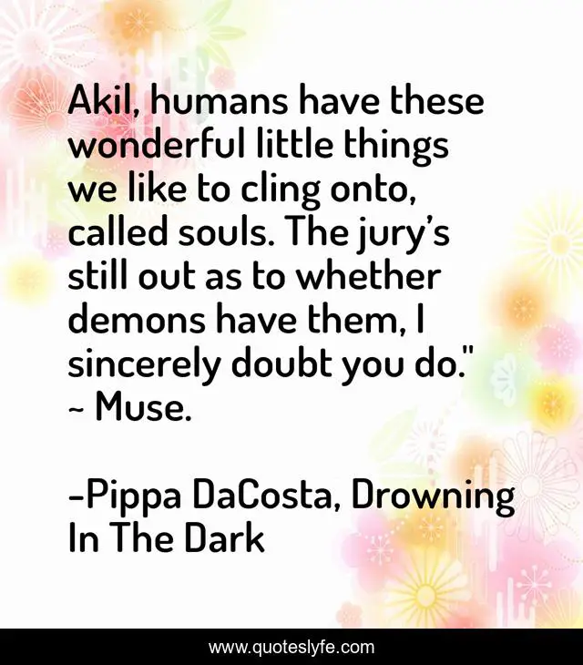 This page presents the quote "Akil, humans have these wonderful little things we like to cling onto, called souls. The jury’s still out as to whether demons have them, I sincerely doubt you do." ~ Muse.". Author of this quote is Pippa DaCosta, Drowning In The Dark. This quote is about the-veil-series, pippa-dacosta, urban-fantasy, souls, demons, muse, muse-to-akil, akil, paranormal-romance,.