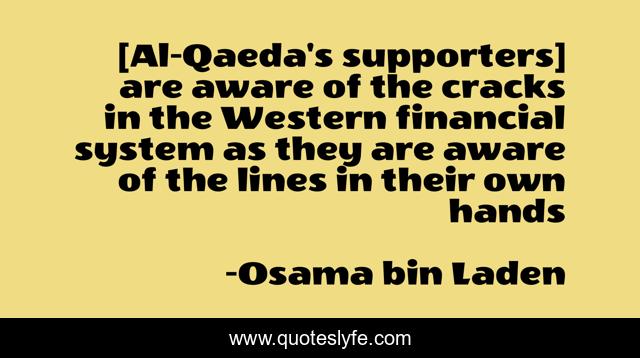 This page presents the quote "[Al-Qaeda's supporters] are aware of the cracks in the Western financial system as they are aware of the lines in their own hands". Author of this quote is Osama bin Laden. This quote is about west, finance, al-qaeda,.