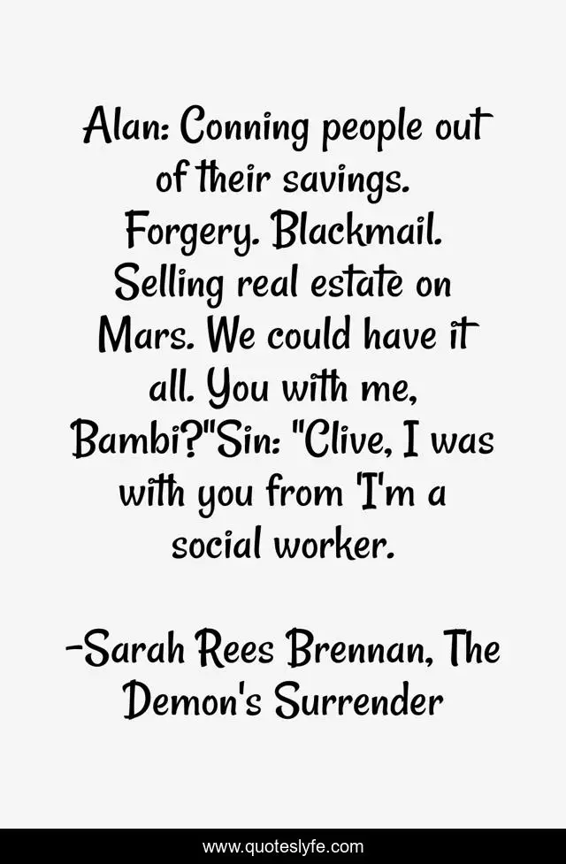 This page presents the quote "Alan: Conning people out of their savings. Forgery. Blackmail. Selling real estate on Mars. We could have it all. You with me, Bambi?"Sin: "Clive, I was with you from 'I'm a social worker.". Author of this quote is Sarah Rees Brennan, The Demon's Surrender. This quote is about humor, young-adult,.