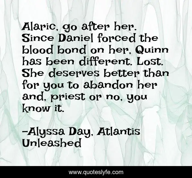 This page presents the quote "Alaric, go after her. Since Daniel forced the blood bond on her, Quinn has been different. Lost. She deserves better than for you to abandon her and, priest or no, you know it.". Author of this quote is Alyssa Day, Atlantis Unleashed. This quote is about alyssa, day,.