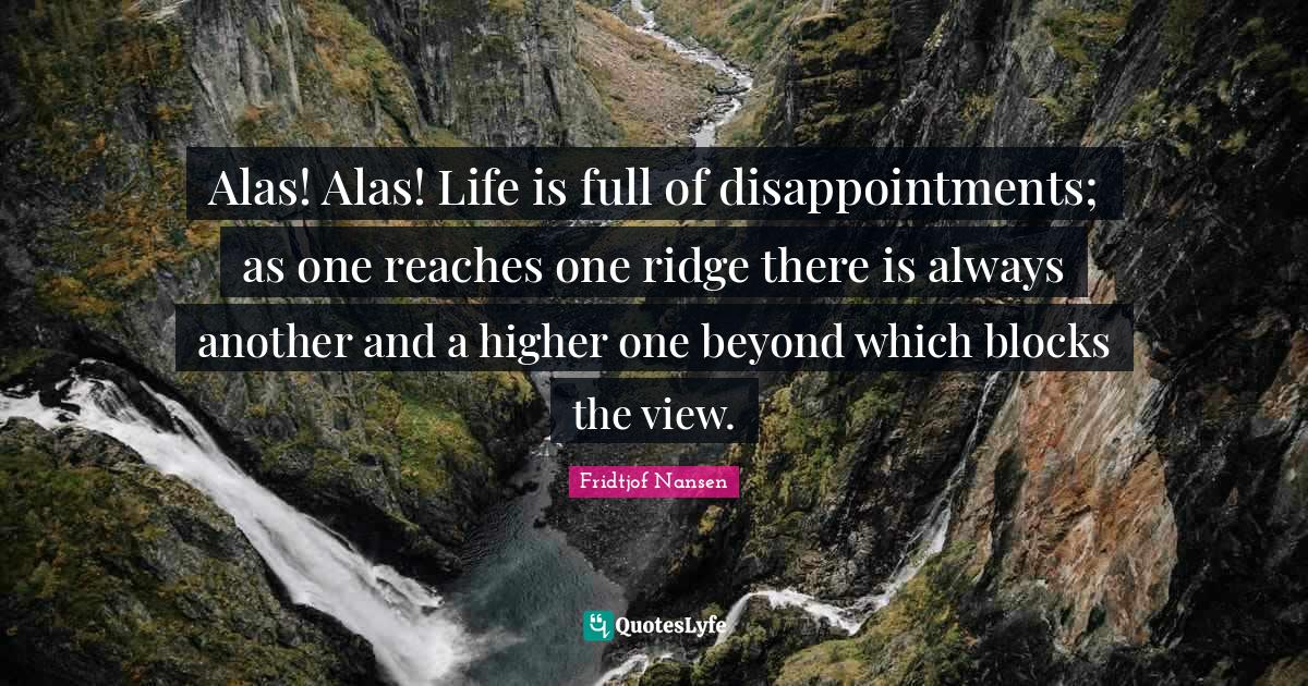 This page presents the quote "Alas! Alas! Life is full of disappointments; as one reaches one ridge there is always another and a higher one beyond which blocks the view.". Author of this quote is Fridtjof Nansen. This quote is about block, alas, life is, higher, disappointment, views,.