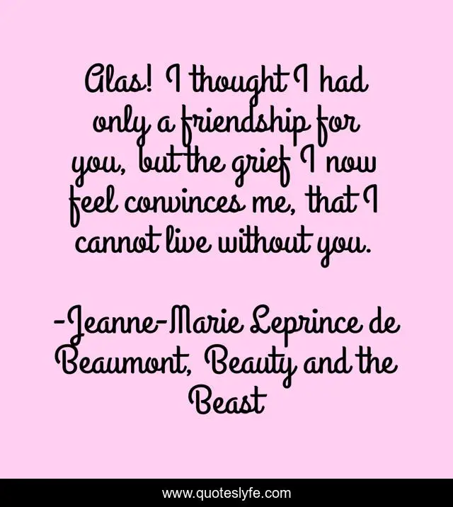 This page presents the quote "Alas! I thought I had only a friendship for you, but the grief I now feel convinces me, that I cannot live without you.". Author of this quote is Jeanne-Marie Leprince de Beaumont, Beauty and the Beast. This quote is about friends-to-lovers, friendship,.