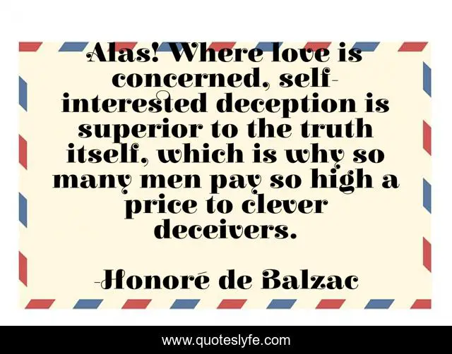 This page presents the quote "Alas! Where love is concerned, self-interested deception is superior to the truth itself, which is why so many men pay so high a price to clever deceivers.". Author of this quote is Honoré de Balzac. This quote is about deception, love, affection,.