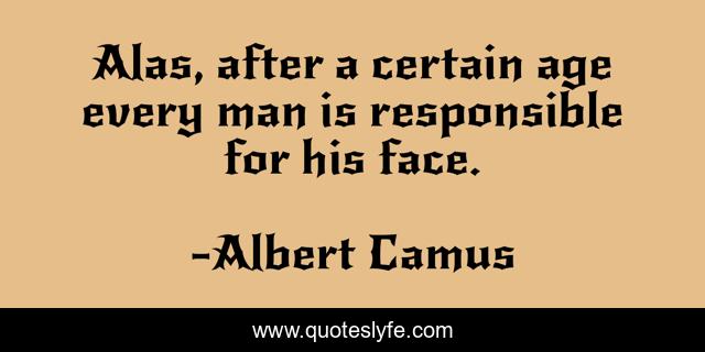 This page presents the quote "Alas, after a certain age every man is responsible for his face.". Author of this quote is Albert Camus. This quote is about responsible, man, face,.