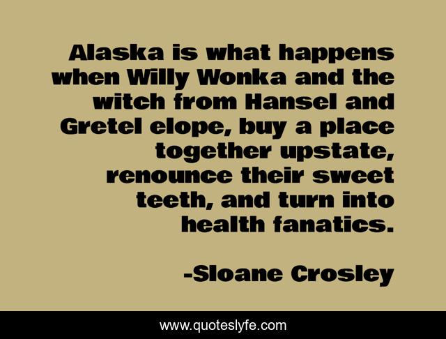 This page presents the quote "Alaska is what happens when Willy Wonka and the witch from Hansel and Gretel elope, buy a place together upstate, renounce their sweet teeth, and turn into health fanatics.". Author of this quote is Sloane Crosley. This quote is about sweet, place, together,.