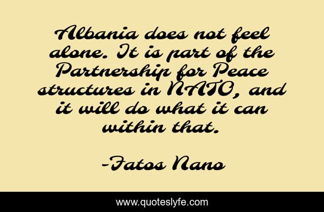 This page presents the quote "Albania does not feel alone. It is part of the Partnership for Peace structures in NATO, and it will do what it can within that.". Author of this quote is Fatos Nano. This quote is about within, partnership, peace,.