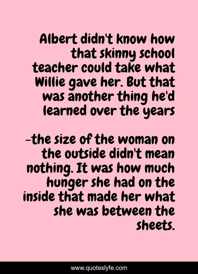 "the size of the woman on the outside didn't mean nothing. It was how much hunger she had on the inside that made her what she was between the sheets. Quotes." Quoteslyfe.com, 2025. Tue. 09 Dec. 2025. <https://www.quoteslyfe.com/quote/Albert-didn-t-know-how-that-skinny-92568>.