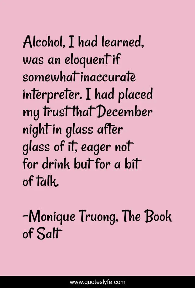 This page presents the quote "Alcohol, I had learned, was an eloquent if somewhat inaccurate interpreter. I had placed my trust that December night in glass after glass of it, eager not for drink but for a bit of talk.". Author of this quote is Monique Truong, The Book of Salt. This quote is about asian-american, alcohol, vietnamese,.