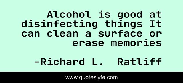 This page presents the quote "Alcohol is good at disinfecting things It can clean a surface or erase memories". Author of this quote is Richard L. Ratliff. This quote is about aa, alcohol, drink, surface, alcoholics-anonymous, clean, drinking, drinking-alcohol,.