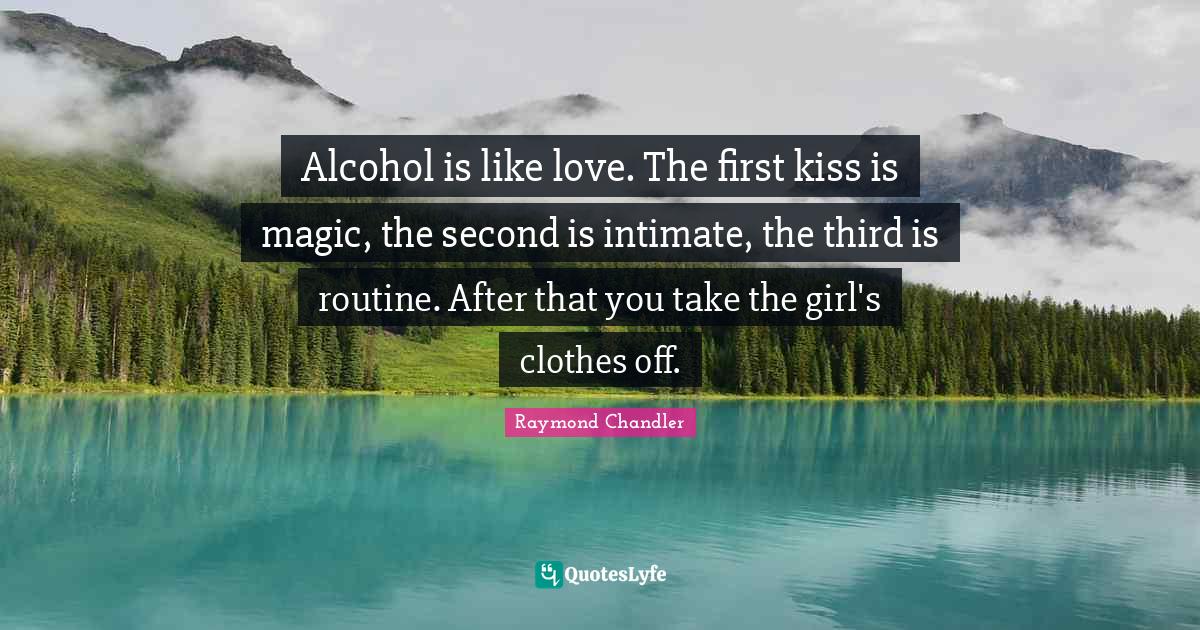 This page presents the quote "Alcohol is like love. The first kiss is magic, the second is intimate, the third is routine. After that you take the girl's clothes off.". Author of this quote is Raymond Chandler. This quote is about girl, alcohol, kiss,.