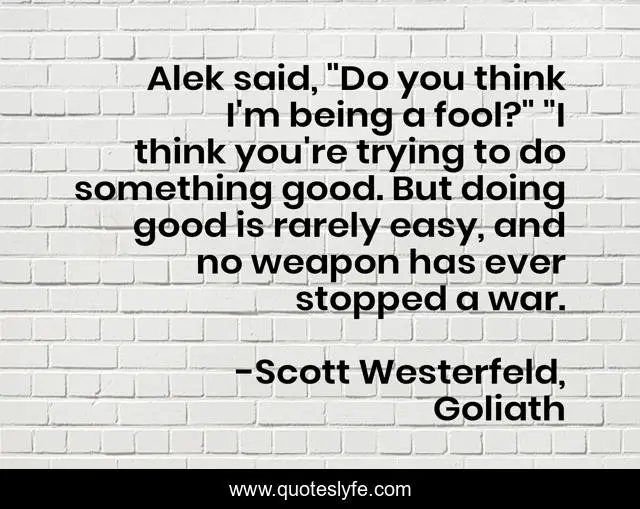 This page presents the quote "Alek said, "Do you think I'm being a fool?" "I think you're trying to do something good. But doing good is rarely easy, and no weapon has ever stopped a war.". Author of this quote is Scott Westerfeld, Goliath. This quote is about weapon, war, doing-good,.