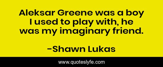 This page presents the quote "Aleksar Greene was a boy I used to play with, he was my imaginary friend.". Author of this quote is Shawn Lukas. This quote is about boy, play, leather, watchmaker, aleksar-greene, friendship,.