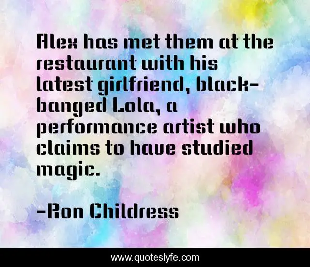 This page presents the quote "Alex has met them at the restaurant with his latest girlfriend, black-banged Lola, a performance artist who claims to have studied magic.". Author of this quote is Ron Childress. This quote is about girlfriend, magic,.