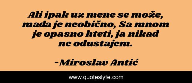 This page presents the quote "Ali ipak uz mene se može, mada je neobično, Sa mnom je opasno hteti, ja nikad ne odustajem.". Author of this quote is Miroslav Antić. .