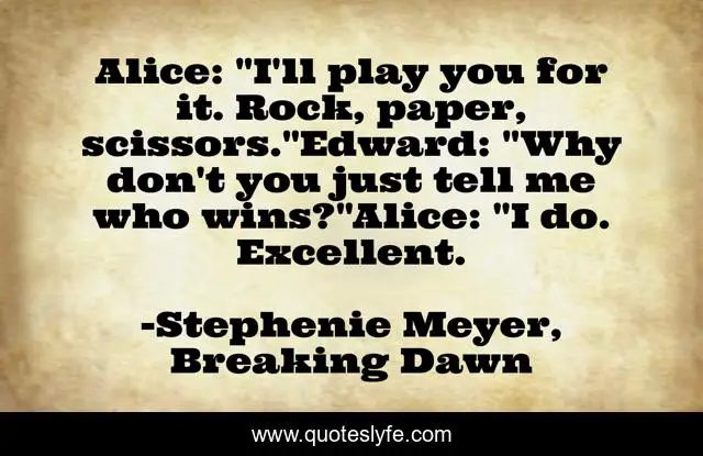 This page presents the quote "Alice: "I'll play you for it. Rock, paper, scissors."Edward: "Why don't you just tell me who wins?"Alice: "I do. Excellent.". Author of this quote is Stephenie Meyer, Breaking Dawn. .