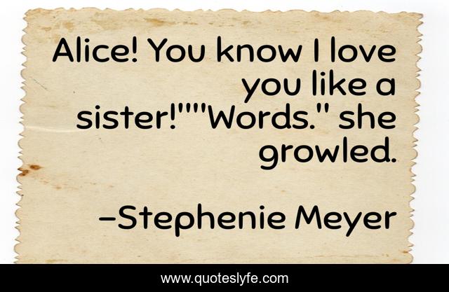 This page presents the quote "Alice! You know I love you like a sister!""Words." she growled.". Author of this quote is Stephenie Meyer. This quote is about humor, vampires, bella-swan, alice-cullen, love, twilight, affection,.