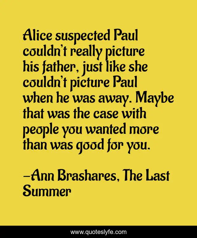 This page presents the quote "Alice suspected Paul couldn’t really picture his father, just like she couldn’t picture Paul when he was away. Maybe that was the case with people you wanted more than was good for you.". Author of this quote is Ann Brashares, The Last Summer. .