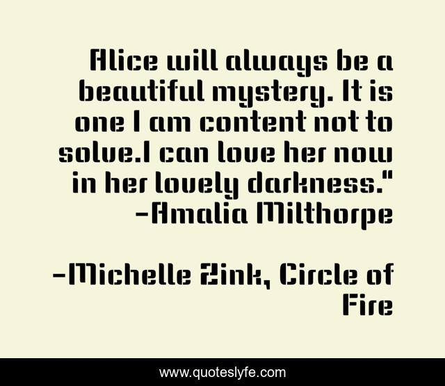 This page presents the quote "Alice will always be a beautiful mystery. It is one I am content not to solve.I can love her now in her lovely darkness." -Amalia Milthorpe". Author of this quote is Michelle Zink, Circle of Fire. This quote is about mystery, death, love, darkness, sacrifice, soul, sisters, end, affection,.