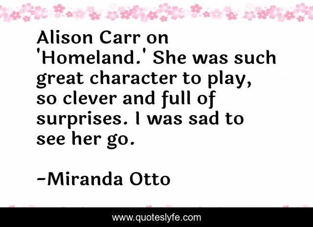 This page presents the quote "Alison Carr on 'Homeland.' She was such great character to play, so clever and full of surprises. I was sad to see her go.". Author of this quote is Miranda Otto. This quote is about great, character, play,.