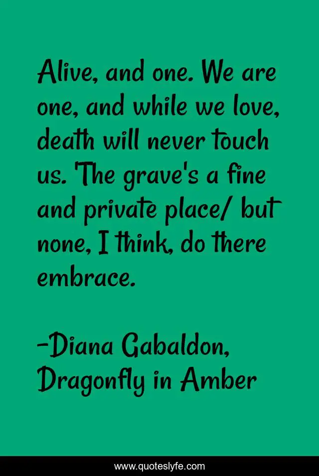 This page presents the quote "Alive, and one. We are one, and while we love, death will never touch us. 'The grave's a fine and private place/ but none, I think, do there embrace.". Author of this quote is Diana Gabaldon, Dragonfly in Amber. This quote is about novel, outlander,.