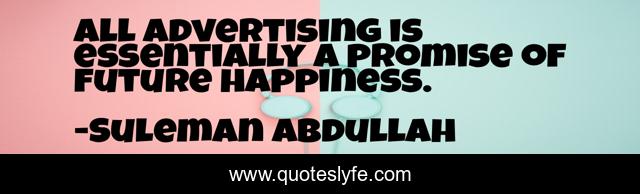 This page presents the quote "All Advertising is essentially a promise of future happiness.". Author of this quote is Suleman Abdullah. This quote is about ads, sales, promise, advertising, brands, happiness, happy,.