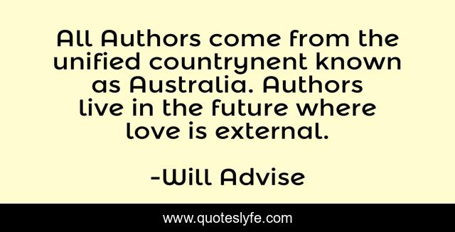 This page presents the quote "All Authors come from the unified countrynent known as Australia. Authors live in the future where love is external.". Author of this quote is Will Advise. This quote is about origin, originating, love, unified, books, continent, geography, knowledge, writing,.