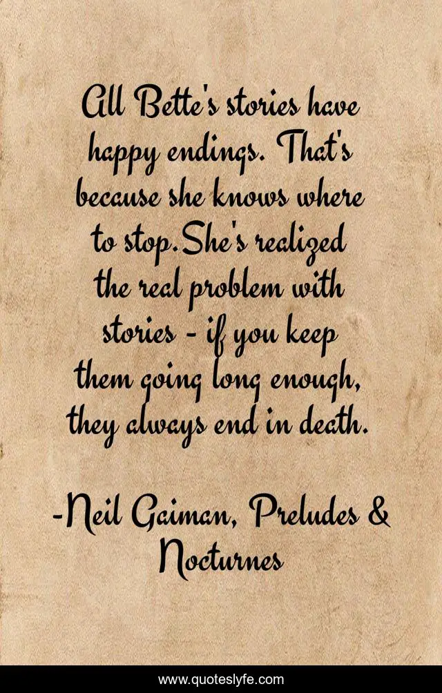 This page presents the quote "All Bette's stories have happy endings. That's because she knows where to stop.She's realized the real problem with stories - if you keep them going long enough, they always end in death.". Author of this quote is Neil Gaiman, Preludes & Nocturnes. This quote is about death, endings, stories, dreams, happy-ending, happiness,.