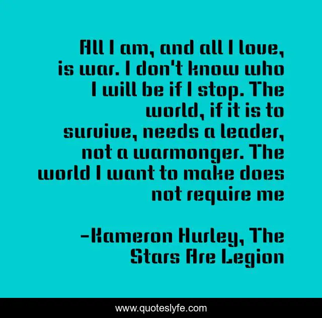 This page presents the quote "All I am, and all I love, is war. I don't know who I will be if I stop. The world, if it is to survive, needs a leader, not a warmonger. The world I want to make does not require me". Author of this quote is Kameron Hurley, The Stars Are Legion. This quote is about space-opera, science-fiction,.