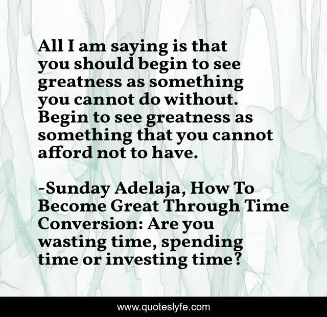 This page presents the quote "All I am saying is that you should begin to see greatness as something you cannot do without. Begin to see greatness as something that you cannot afford not to have.". Author of this quote is Sunday Adelaja, How To Become Great Through Time Conversion: Are you wasting time, spending time or investing time?. This quote is about convert, productivity, wealth, gift, work, life, great, value, calling,.