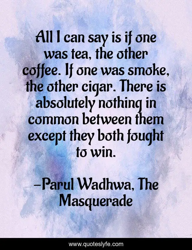This page presents the quote "All I can say is if one was tea, the other coffee. If one was smoke, the other cigar. There is absolutely nothing in common between them except they both fought to win.". Author of this quote is Parul Wadhwa, The Masquerade. This quote is about love, proposal-goals, passionate-living, life-and-sayings, together-forever, quotes-to-live-by, eternal-happiness, life-is-bliss, affection,.