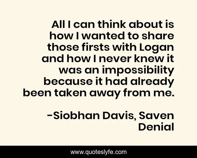 This page presents the quote "All I can think about is how I wanted to share those firsts with Logan and how I never knew it was an impossibility because it had already been taken away from me.". Author of this quote is Siobhan Davis, Saven Denial. This quote is about teen-romance, teen-scifi-romance, coming-of-age, teen-love,.