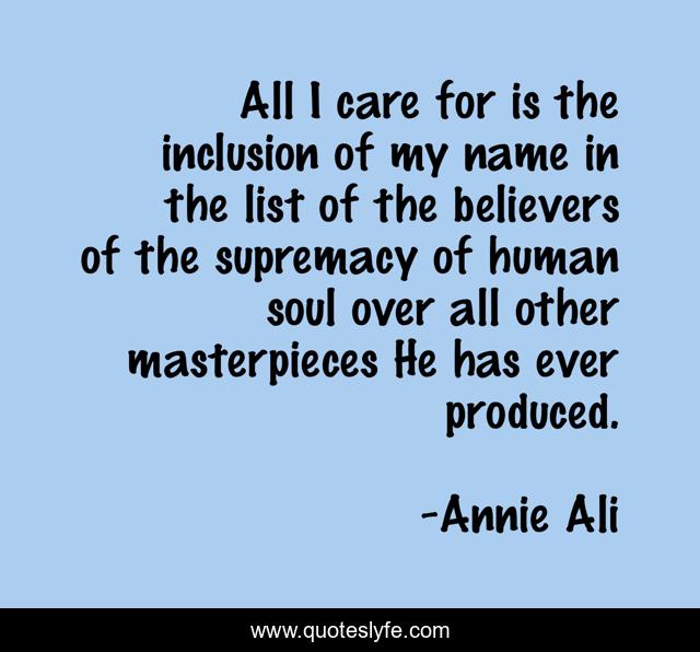 This page presents the quote "All I care for is the inclusion of my name in the list of the believers of the supremacy of human soul over all other masterpieces He has ever produced.". Author of this quote is Annie Ali. This quote is about love, name, soul, produce, supremecy, humanity, affection, care,.