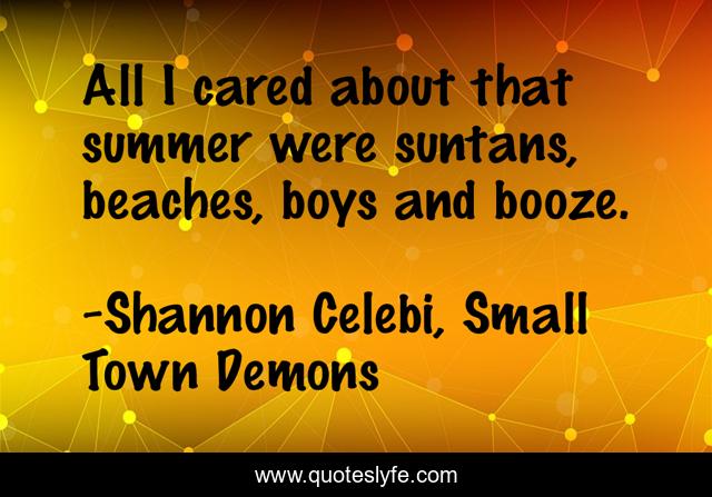 This page presents the quote "All I cared about that summer were suntans, beaches, boys and booze.". Author of this quote is Shannon Celebi, Small Town Demons. This quote is about summer-nights, summer, youth, boys, booze, summertime, beach, beaches, boyfriend,.