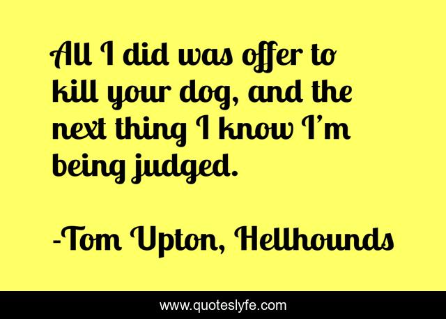This page presents the quote "All I did was offer to kill your dog, and the next thing I know I’m being judged.". Author of this quote is Tom Upton, Hellhounds. This quote is about teen, dark-humor, young-adult,.
