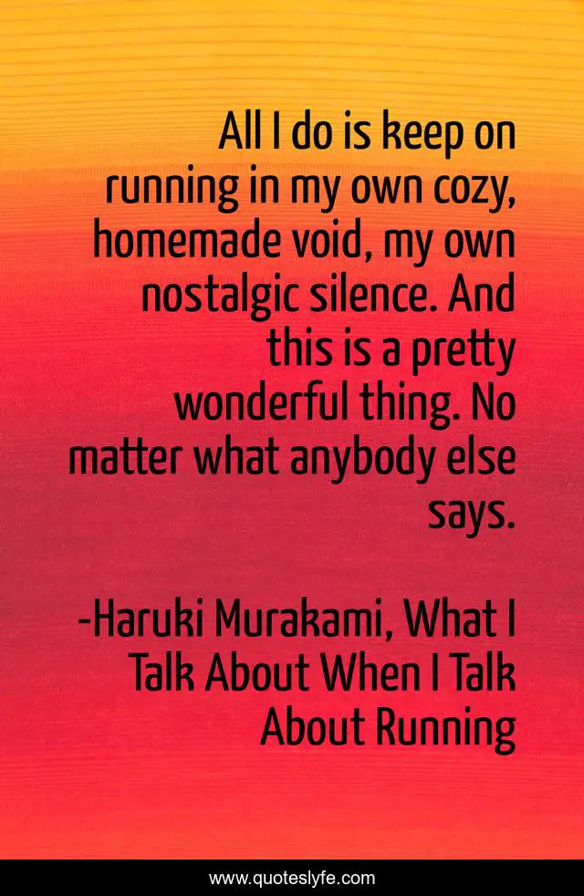 This page presents the quote "All I do is keep on running in my own cozy, homemade void, my own nostalgic silence. And this is a pretty wonderful thing. No matter what anybody else says.". Author of this quote is Haruki Murakami, What I Talk About When I Talk About Running. .