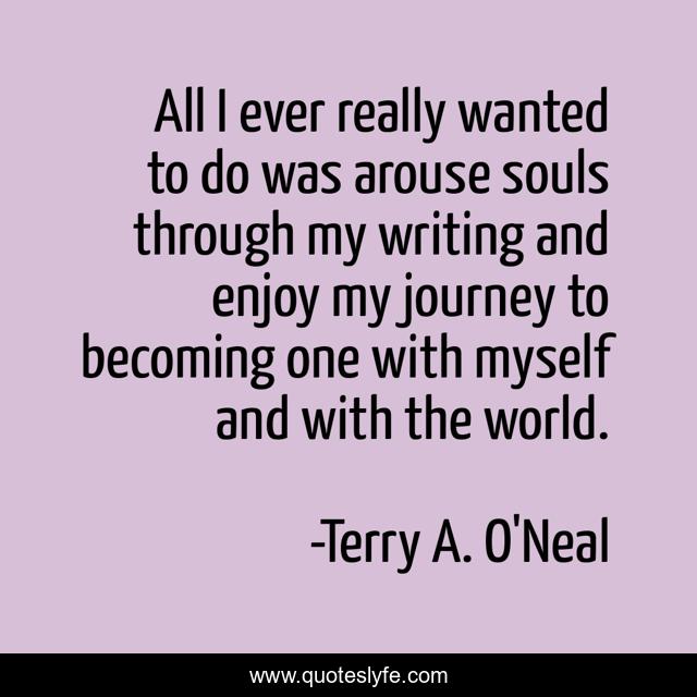 This page presents the quote "All I ever really wanted to do was arouse souls through my writing and enjoy my journey to becoming one with myself and with the world.". Author of this quote is Terry A. O'Neal. This quote is about love, taoneal, giving, poetry-of-life, passion, desires-and-dreams, humanity, affection,.
