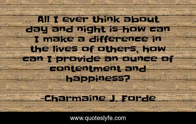 This page presents the quote "All I ever think about day and night is-how can I make a difference in the lives of others, how can I provide an ounce of contentment and happiness?". Author of this quote is Charmaine J. Forde. This quote is about difference, contentment, happiness, ounce,.
