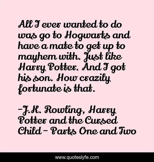 This page presents the quote "All I ever wanted to do was go to Hogwarts and have a mate to get up to mayhem with. Just like Harry Potter. And I got his son. How crazily fortunate is that.". Author of this quote is J.K. Rowling, Harry Potter and the Cursed Child - Parts One and Two. .