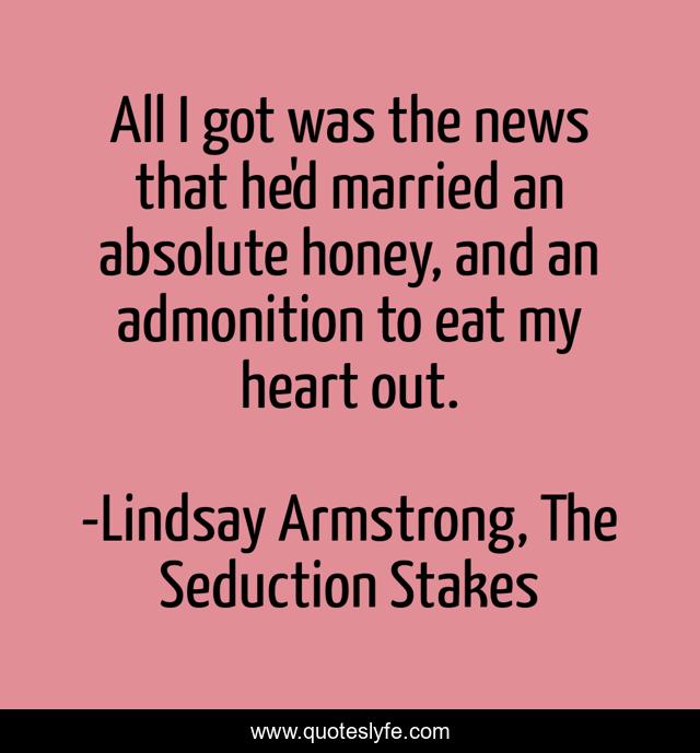 This page presents the quote "All I got was the news that he'd married an absolute honey, and an admonition to eat my heart out.". Author of this quote is Lindsay Armstrong, The Seduction Stakes. This quote is about jealousy, marry, marriage,.