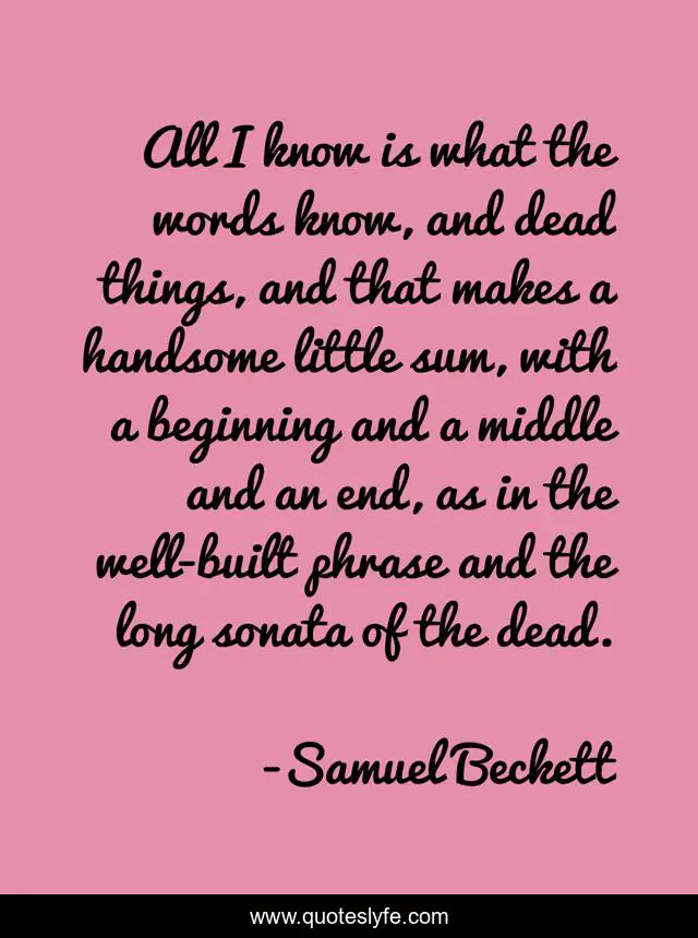 This page presents the quote "All I know is what the words know, and dead things, and that makes a handsome little sum, with a beginning and a middle and an end, as in the well-built phrase and the long sonata of the dead.". Author of this quote is Samuel Beckett. This quote is about irish, samuel, writer, dead, words, beckett,.