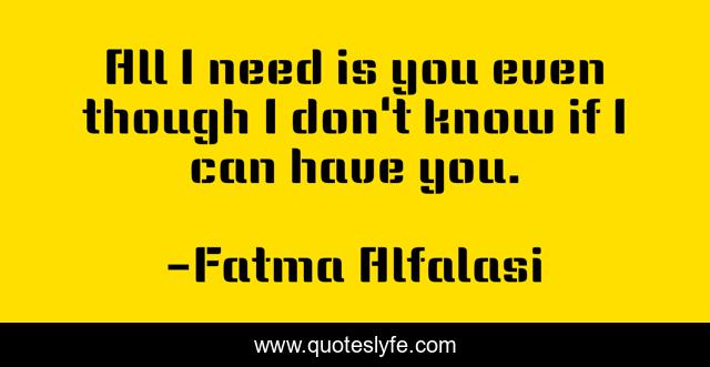This page presents the quote "All I need is you even though I don't know if I can have you.". Author of this quote is Fatma Alfalasi. This quote is about needs, love, wanting-wanting-and-needs, have-faith, needs-and-wants, need, having, affection,.