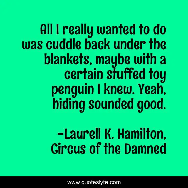 This page presents the quote "All I really wanted to do was cuddle back under the blankets, maybe with a certain stuffed toy penguin I knew. Yeah, hiding sounded good.". Author of this quote is Laurell K. Hamilton, Circus of the Damned. This quote is about humor, hiding,.