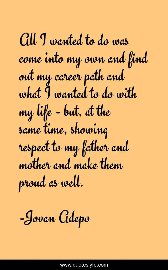 This page presents the quote "All I wanted to do was come into my own and find out my career path and what I wanted to do with my life - but, at the same time, showing respect to my father and mother and make them proud as well.". Author of this quote is Jovan Adepo. This quote is about life, father, time,.