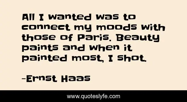 This page presents the quote "All I wanted was to connect my moods with those of Paris. Beauty paints and when it painted most, I shot.". Author of this quote is Ernst Haas. This quote is about paris, connect,.