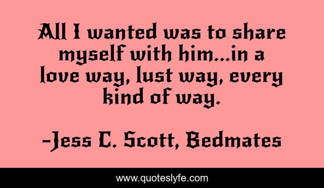 This page presents the quote "All I wanted was to share myself with him...in a love way, lust way, every kind of way.". Author of this quote is Jess C. Scott, Bedmates. This quote is about desire, lovers, love, lust, passion, affection,.