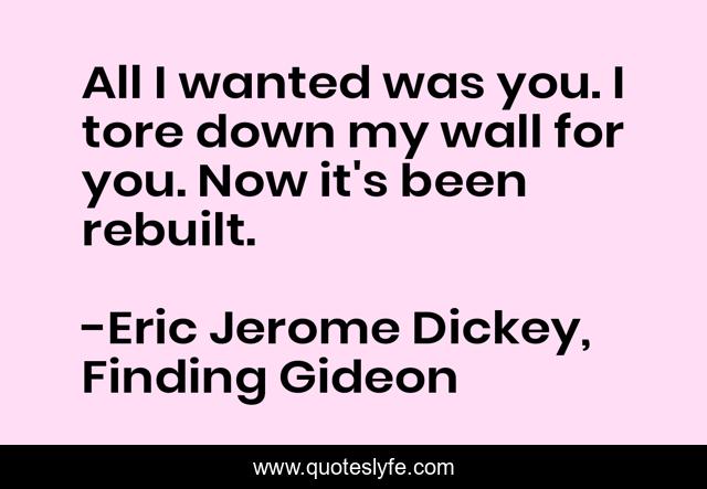 This page presents the quote "All I wanted was you. I tore down my wall for you. Now it's been rebuilt.". Author of this quote is Eric Jerome Dickey, Finding Gideon. This quote is about gideon, heart, dialogue, arizona,.